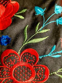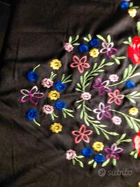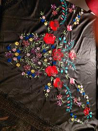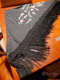Scialle 3 Scialle spagnolo acquistato a Barcellona negli anni 70/80. Triangolare, misura 150x110x110 comporta anche una frangia di cm 15. E’ nero si evidenziano bellissimi fiori multicolore, tenuto in ottime condizioni come si evince dalle foto. Prezzo: €. 15