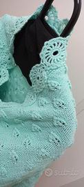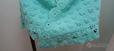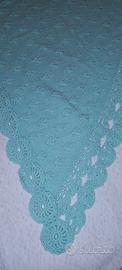 Elegante Scialle in morbida e calda lana colore verde acqua, NUOVO, mai usato, lavora-zione artigianale ad aghi e bordo all’uncinetto. Dimensioni lato lungo 136 cm, lato corto 53 cm, altezza 65 cm. Perfetto per aggiungere un tocco di stile.