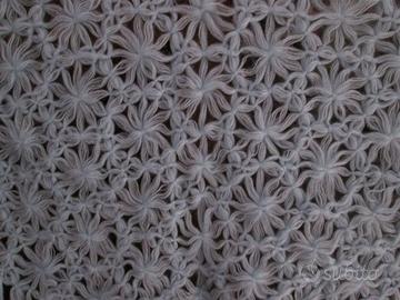 Scialle triangolare molto grande di lana pesante, color bianco, con frangia molto lunga, fatto a mano e mai indossato.
