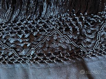 Due scialli sardi, in tibet di lana rispettivamente nero e bianco, originali di Oliena, sapientemente ricamati a mano con decoro floreale. Frange in seta.