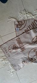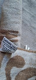 morbida e calda sciarpa di pura lana merino con frangia, colore marrone con scritte, altro lato colore beige con scritte Moschino