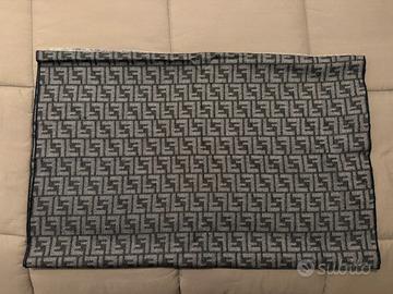 Sciarpa rettangolare realizzata in Jacquard micro FF di lana color blu jeans. Rifinita con frange sul fondo.