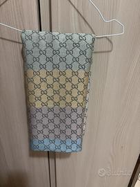 Sciarpa Gucci in viscosa metallizzata multicolore. Frange alle estremità. Stampa monogramma GG. Prodotto in Italia.