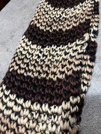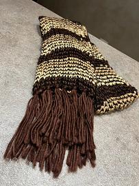 Sciarpa morbida e calda, realizzata a mano con filato spesso in lana nei toni del marrone, beige e crema. Lavorazione a maglia con motivo a righe e frange lunghe marroni su entrambe le estremità. Perfetta per l'inverno e l'autunno, tiene ben caldo. Ideale per aggiungere un tocco originale a qualsiasi outfit.