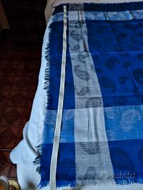 Grande stola da donna. Foulard grande. Perfetta per essere indossata in vari modi. Colore blu con decorazioni. Misto lana. Usata, ottime condizioni. Misure cm 120x115. Venduta lavata e pulita.