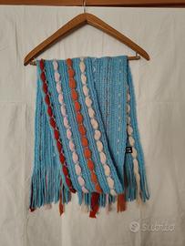 Sciarpa lunga con frange, colore azzurro con inserti rosso, rosa, arancio e bianco, 100% lana, tipo lavorazione a mano. Misure cm 18x190. Mai usata. Condizioni come da foto.