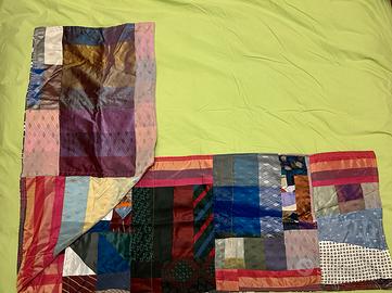 Sciarpa mantiglia Inverno al Sud. Collage fatto con scampoli, tessuto per cravatte, tirelle colori e cravatte. Anima in cotone. Composizione: cotone, seta e altri materiali sintetici ad effetto raso/cangiante. L’ho personalmente fatta (tagliata e cucita a macchina) in molte ore di dedizione. Molto calda e piacevole al contatto sul volto. Datasi la composizione in materiali così diversi e a volte sintetici, si consiglia il lavaggio a secco. Dimensioni (tagliata a mano senza matrici, pezzo per pezzo, per cui spesso irregolare nelle dimensioni): Altezza 1 cm. 51. Altezza di mezzo cm. 51. Altezza 2 cm. 50. Lunghezza 1 cm. 234. Lunghezza 2 cm. 233.