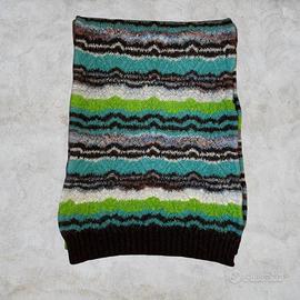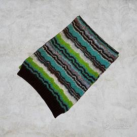 Splendida sciarpa Missoni originale, un pezzo versatile e senza tempo caratterizzato dalla celebre lavorazione a maglia fiammata del brand. Perfetta per dare un tocco di colore e prestigio a qualsiasi outfit invernale o autunnale. Dettagli del Capo: • Brand: Missoni (Etichetta arancione vintage/classica visibile in foto). • Pattern: Iconico motivo a zig-zag (chevron) con mix di colori vibranti: verde acido, turchese, bianco, marrone e tocchi di azzurro. • Materiale: Maglia pregiata, soffice al tatto e calda (tipica lavorazione Missoni). • Condizioni: Ottime condizioni, mantenuta con estrema cura. Nessun filo tirato evidente. • Dettagli extra: Rifinitura a coste su uno dei bordi per una migliore tenuta e struttura. Perché sceglierla? È un accessorio unisex che non passa mai di moda. La qualità del Made in Italy si sente al tatto; ideale sia per un look casual che per uno stile più ricercato.