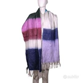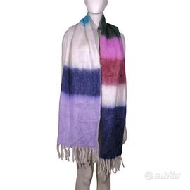 Sciarpa taglia unica di GAP, in tessuto sintetico simile all'angora, lunga e ampia, multicolor, in colori sfumati che passano dal grigio al bianco al verde e al rosa per tornare al bianco e al grigio. La sciarpa termina con le frange bianche.