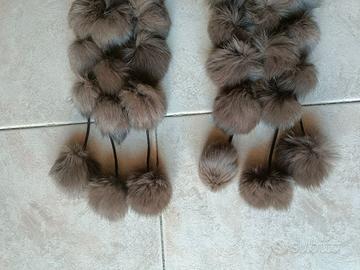 Sciarpa morbida Geospirit tortora beige con pon pon in pelliccia coniglio e lana