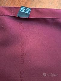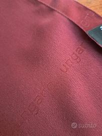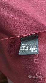 Sciarpa in seta di Emanuel Ungaro in color bordeaux/vinaccia, il logo "ungaro" è stampato tono su tono nella trama del tessuto, l'etichetta visibile conferma la composizione in 100% seta pura e l'autenticità del marchio, noto per i suoi accessori di lusso. Mis.145x33