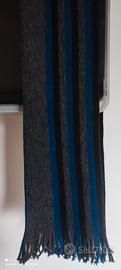 Questa è una sciarpa in maglia a righe blu, grigie e nere con un'etichetta "GC FASHION DESIGNER".