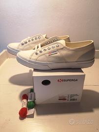 Scarpe Superga color bianco/panna numero 41 con 3 tipi di lacci (bianco/panna, verdi e rossi).