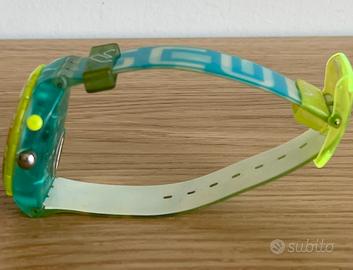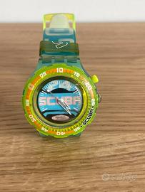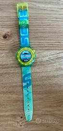 orologio Swatch Scuba 200, modello Loomi Aquazone (SDN122), risalente al 1999. Si tratta di un orologio subacqueo vintage, con un design colorato e audace, tipico degli anni '90.
