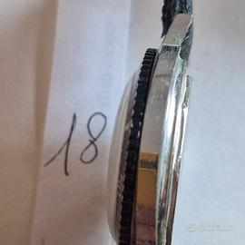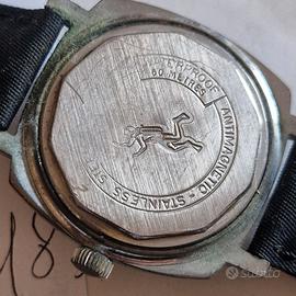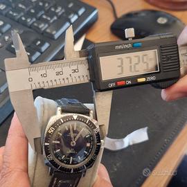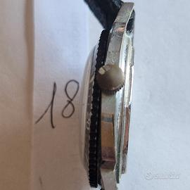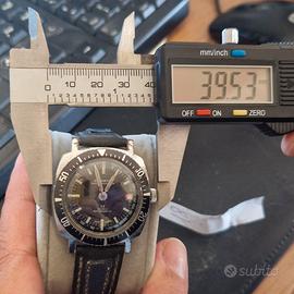 Orologio che presenta caratteristiche coerenti con la produzione 'skin diver' degli anni '70. Sul quadrante la stampa del marchio 'SEAWATCH' e le specifiche '23 JEWELS ANTIMAGNETIC' mostrano un'usura e una patina del trizio (ormai virato al verde/grigio) tipiche dell'epoca. La scala tachimetrica interna è correttamente allineata. La cassa presenta la tipica costruzione in metallo base cromato con evidenti segni di corrosione e perdita di placcatura sulle anse, un fenomeno comune per questi modelli basici che non utilizzavano acciaio inossidabile integrale per la cassa media. Il fondello a vite in acciaio inossidabile mostra l'incisione del subacqueo e le diciture 'ANTIMAGNETIC - STAINLESS STEEL BACK', che sono standard per questa tipologia di orologi prodotti da assemblatori svizzeri dell'epoca. La ghiera bidirezionale in alluminio mostra graffi coerenti con l'età, e il datario a ore 3 con numeri rossi è un dettaglio d'epoca autentico. Considerazioni di Mercato E' uno 'skin diver' vintage ricercato dai collezionisti per il loro design iconico. Seawatch era uno dei numerosi marchi svizzeri (spesso legati a produttori come Cimier o Lapanouse) che durante gli anni '60 e '70 producevano orologi subacquei accessibili. Questi orologi montavano spesso movimenti a caviglie (pin-lever) o movimenti meccanici economici ma robusti, democratizzando lo stile degli orologi subacquei professionali come il Blancpain Fifty Fathoms o il Rolex Submariner per il mercato di massa.