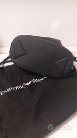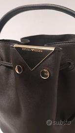 Borsa modello secchiello Emporio Armani, in pelle saffiano nera, con chiusura a coulisse, provvista di pratico manico superiore per portarla a mano e di pratica tracolla regolabile e removibile. Piccolo portamonete interno. Vendo per inutilizzo.