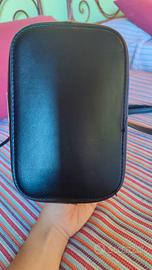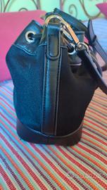 Borsa secchiello nero, piccola 18x12x21 cm, tessuto esterno in poliestere con rifiniture in finta pelle (poliuretano). Tracollina regolabile e chiusura a sacco. Usata poche volte, non presenta segni di danneggiamento, rifiniture in ottime condizioni.