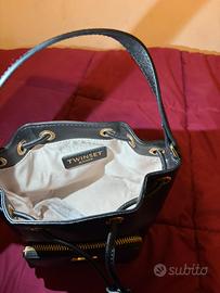 Borsa Twinset Milano nera modello secchiello con finiture oro e logo frontale.