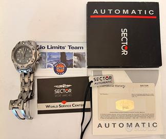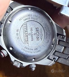 Sector 950 Crono Titanio Automatico Swiss Made. Condizioni eccellenti. Vetro zaffiro perfetto. Impermeabilità 300 metri. Movimento svizzero Valjoux 7750. Materiale :Titanio. Bracciale in vero titanio con fibbia. Meccanico Automatico (con carica manuale e funzione hack). Funzioni: cronografo / piccoli secondi / calendario. Specifiche: lunetta girevole unidirezionale, corona a vite, Quadrante: grigio Dimensioni della cassa: 42 mm di diametro (esclusa la corona). Orologio Full Set: completo di scatola, controscatola, garanzia ufficiale e tutti i suoi libretti più maglia aggiuntiva. Revisionato a febbraio 2026. Prodotto originale