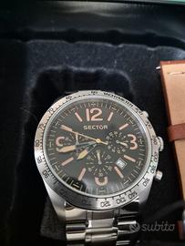 Crono da uomo al quarzo credo movimento Giapponese Myota, cassa in acciaio 44 mm di diametro la ghiera ha la scala tachimetrica color nero, quadrante di color marrone con gli indici color arancio. Il datario è posizionato tra le ore 4 e le ore 5, mentre ore 3 ha l’indicazione delle 24 ore. Vetro minerale antiriflesso il bracciale è pelle morbida di color cuoio. Ho fatto montare da nuovo un bracciale acciaio ma poi non l’ho mai indossato, è presente anche il cinturino originale. Preferibile la consegna a mano
