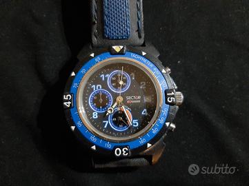 Orologio cronografo Sector modello Expander 130 con movimento al quarzo. ⏱️ Cassa in Alluminio leggero nero con lunetta blu, fondello a vite in Acciaio Inox. Water Resistant 100 metri. Quadrante nero con tre contatori e datario a ore 3. 📅 Cinturino originale misto tessuto tecnico e pelle. 🔍 Ideale per chi cerca un orologio leggero ma robusto.