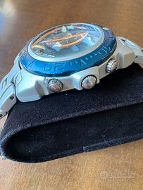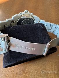 Vendo iconico orologio Sector Expander EXP 150 della serie Alutek, un classico dell'orologeria sportiva anni '90. Il modello si distingue per l'estrema leggerezza grazie alla costruzione interamente in alluminio. Modello: Sector No Limits - Expander 150 (Alutek) Funzioni: Cronografo al quarzo con datario a ore 4. Materiale: Cassa e bracciale in alluminio satinato (molto leggero al polso). Estetica: Quadrante blu con tre contatori e ghiera girevole unidirezionale blu coordinata. Dimensioni: Cassa da circa 40mm, ideale per ogni tipo di polso. Stato: Segni di usura visibili in foto, batteria appena sostituita.