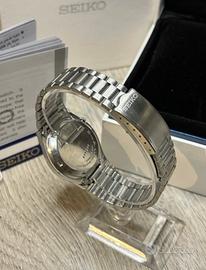 • Quadrante: Oro con texture a scacchi, indici applicati e logo Seiko 5 in rilievo.