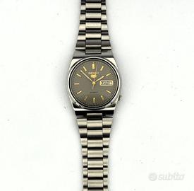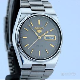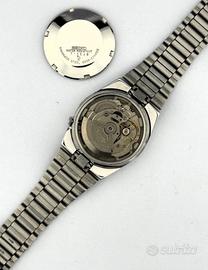 Orologio automatico vintage Seiko 5, riferimento 6309-8350-A5, prodotto in Giappone tra il 1970 e il 1979. Movimento automatico originale funzionante. Cassa in acciaio inossidabile da 36mm. Bracciale in acciaio originale. Quadrante originale, non riverniciato. Vetro integro. Condizioni molto buone con minimi segni di usura normali per un orologio dell’epoca. Niente scatola né documenti originali.