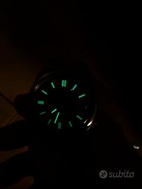 Dettagli: indici applicati luminescenti e logo Seiko 5 a rilievo.