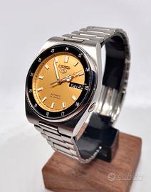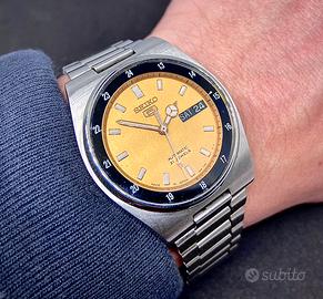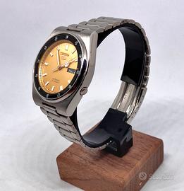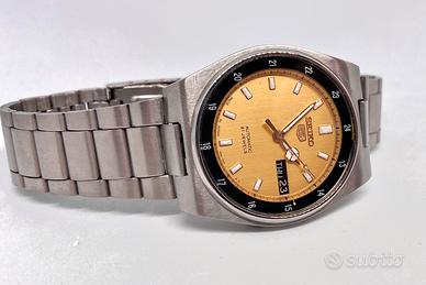 ⚠️Orologio ORIGINALE 100% SEIKO - RICONDIZIONATO, ♦️seriale su fondello,referenza su fondello e referenza su quadrante 🆗 ⭐️CONDIZIONI PERFETTE ⭐️REVISIONATO MECCANICAMENTE ⭐️TOTALMENTE LUCIDATO ‼️Funzionamento e tenuta del tempo garantiti ‼️Guarda il video dimostrativo sul mio canale Youtube: gian_watches **Seiko** '5' automatico, quadrante concentrico in una configurazione molto rara con la parte centrale color oro e contorno stile GMT con le 24h incise in colore nero. Solitamente si trovano con quadrante e ghiera in un’unica tonalità di nero. Fresh dial molto leggibile. Stile railway con bracciale integrato premium. Sfera dell'ora stile mercedes. Effetto super vintage ma al contempo affidabilissimo e tutto originale e coevo. ‼️Caratteristiche: ✅Cassa con pieno, chiusura a vite e corona a pressione ✅Movimento 7s26 Seiko indistruttibile, robusto e facilmente manutenibile 21.600 alternanze/ora e 21 rubini ✅Riserva di carica ottima di circa 42 ore ✅Data a scatto rapido (quickset) ✅Doppio datario giorno mese/giorno settimana ✅Quadrante color oro senza difetti o polveri, perfetto ✅Dimensioni (larghezza) cassa: 37mm (esclusa corona) ✅Bracciale originale Seiko ✅Doppio datario day-date ✅Corona ore 4 a scomparsa ✅Vetro minerale senza graffi o difetti 📦Scatola porta orologi generica in omaggio 💎Test corretto funzionamento pre spedizione Spedizione veloce e garanzia soddisfatti 🔝 👀Dai un occhio al mio profilo se ti piacciono gli orologi