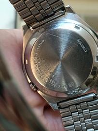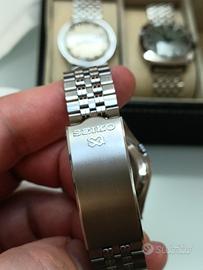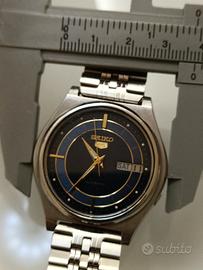 Seiko 5 Automatico Vintage Blu (7009-3170) - Funzionante Vendo Seiko 5 Automatico (Ref. 7009-3170) anni '90, caratterizzato da un elegante quadrante blu "sunray" con dettagli dorati e anelli concentrici. Caratteristiche principali: Movimento: Automatico Seiko Cal. 7009 (funzionante). Funzioni: Datario completo (Giorno/Data) a ore 3. Cassa e Bracciale: Acciaio inossidabile originale con chiusura logata Seiko SQ. Dimensioni: Cassa da 37 mm, ideale per ogni polso. Condizioni: L’orologio è originale e marciante. Trattandosi di un pezzo vintage, presenta segni di usura sulla cassa e alcuni graffi sul vetro (visibili in foto), che non ne compromettono l'utilizzo ma ne testimoniano l'autenticità. Ottimo pezzo per collezionisti o per chi cerca un orologio automatico affidabile e di classe a un prezzo contenuto. Disponibile per consegna a mano o spedizione veloce