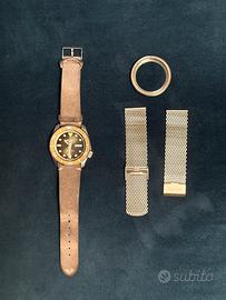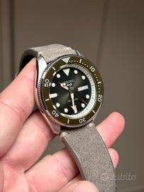 Vendo seiko 5. Presente cinturino milanese originale (mai indossato). Ghiera originale. Presente sctola originale. Secondo cinturino in pelle. La ghiera montata è aftermarket perché l’originale non mi piaceva. Ad ogni modo l’originale è presente. Basta sostituire l’anello colorato con i numeri se si volessi rispristinare come da fabbrica. Azione veramente semplice.