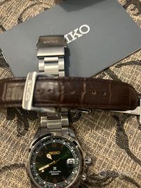 Vendo Seiko alpinist spn121j1 nuovo anno novembre 2025 , indossato non più di tre volte , completo di doppio bracciale , in pelle con deployante e in acciaio Seiko del valore di circa 200 euro , nuovo senza un graffio . Referenza in ascesa perché da poco uscito fuori produzione .