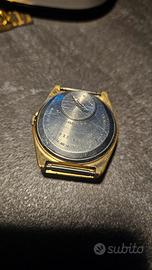 Orologio Seiko vintage da uomo dorato, modello 3AZ Quartz con day-date anni '70-'80, cassa tondeggiante in oro placcato. Venduto senza cinturino, da riparare o per parti. Dettagli principali: - Quadrante oro con logo Seiko, datario e giorno alle 3, diametro ca. 36-38 mm. - Retro inciso "Base Metal Top S/Steel Bezel T 320689", movimento al quarzo giapponese. - Chiusura a barrette, graffi evidenti su cassa e vetro (visibili in foto). - Non testato se funzionante, placcatura usurata. Condizioni e stile: Stato project/parts: graffi marcati, ideale per restorers o collezionisti Seiko vintage. Peso solido.
