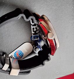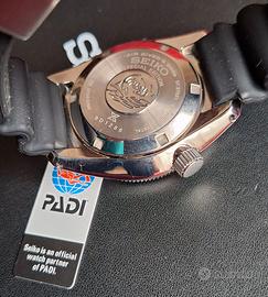 Cassa in acciaio inossidabile di 44 mm con 200 metri di impermeabilità. La lunetta, caratterizzata dai colori rosso e blu tipici di Padi, ruota con scatti nitidi per un cronometraggio preciso. La grande lancetta delle ore a freccia larga e la lancetta centrale dei secondi con pip LumiBrite assicurano un'eccellente visibilità anche nelle profondità marine. Il logo Padi è ben visibile al centro del quadrante, mentre la data è comodamente posizionata a ore tre – Movimento calibro 6R15, un movimento di manifattura Seiko che vanta una riserva di carica di 50 ore e il sistema di carica automatica bidirezionale Magic Lever. Il movimento funziona a 21.600 giri al minuto e comprende la possibilità di carica manuale e un meccanismo di hack per la sincronizzazione precisa della lancetta dei secondi - cinturino in silicone che è tra i più morbidi e confortevoli cinturini da immersione disponibili. Questa nuova versione presenta un minor numero di pieghe a fisarmonica in corrispondenza delle anse e include una fibbia firmata con un'unica chiusura firmata in acciaio inossidabile.