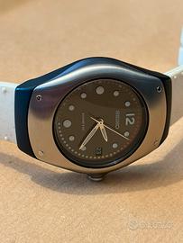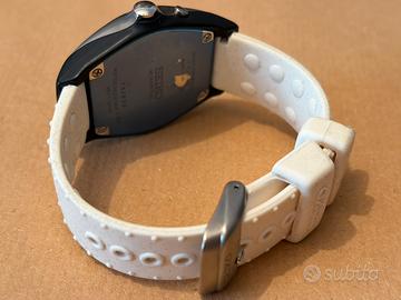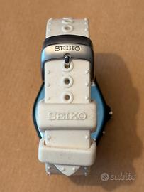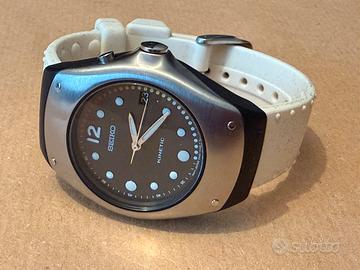 Orologio Seiko Kinetic originale, referenza 5M42-0E49, in ottime condizioni generali. Acquistato a settembre 2025 presso negozio come fondo di magazzino (NOS), mai utilizzato prima dell’acquisto. A ottobre 2025 è stato effettuato il cambio dell’accumulatore, pertanto l’orologio è perfettamente funzionante e pronto all’uso. Cassa in acciaio con inserti in materiale composito, quadrante blu con design distintivo e datario. Movimento Kinetic Seiko (calibro 5M42). Completo di scatola originale Seiko. Condizioni estetiche molto buone, con normali segni sul cinturino dovuti all’uso. Orologio particolare e non comune, ideale per appassionati Seiko e collezionisti.