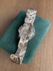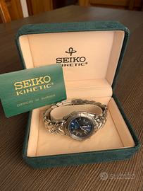 Dalla mia collezione in vendita splendido e raro Seiko Kinetic SQ100 ref. 5M42-0A80 con movimento automatico cinetico al quarzo. La massa oscillante a mezza luna con il solo movimento del polso ricarica continuamente il capacitore che alimenta l’orologio. Se non indossato rimane funzionante per circa 6 mesi con capacitore carico. Tramite pulsante a ore 13 si può visualizzare la carica restante. In splendide condizioni come da foto. Necessita della sostituzione del capacitore in quanto non indossato da un po’ di tempo. Completo di box, card di garanzia ormai scaduta e istruzioni tutto originale. Diametro 39mm, altezza 12mm, larghezza ansa 20mm. Bracciale in acciaio misto lucido-satinato con originale deployante e vetro zaffiro. Fondo a vista in cristallo con visualizzazione del movimento cinetico. Nessun graffio o urto. Non si accetta reso essendo fuori garanzia. No perditempo.