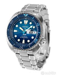 Orologio subacqueo professionale in edizione speciale "THE GREAT BLUE", dotato di calibro 4R36 con una riserva di carica di 41 ore. Cassa in acciaio con l'iconica forma “King Turtle” e bracciale in acciaio inossidabile con rivestimento antigraffio. Ghiera girevole unidirezionale in ceramica. Impermeabilità garantita fino a 200 metri. Diametro cassa 45 mm, vetro zaffiro. Il motivo del quadrante riflette la superficie dell'Oceano vista da sotto l'acqua, con la luce del sole che scende e la superficie dell'acqua in movimento. Caratteristiche tecniche Colore quadranteBlu Materiale CassaAcciaio Diametro Cassa45mm Spessore Cassa13,22 mm Vetro Zaffiro Resistenza all'acqua200 metri/ 20 BAR MovimentoAutomatico Specifica Movimento4R36 Ansa22mm Full set, appena revisionato Seiko, ancora in garanzia con cinturino in gomma aggiuntivo. 450€