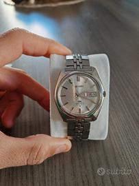 Seiko Lord Matic referenza inconica LM 5606-7000 23J quadrante argento orologio in perfette condizioni del 1971, Cassa Acciaio da 37 millimetri ad esclusione della corona di carica, Dial originale argento , sfere in splendide condizioni , corona doppio scatto Ok per cambio data e giorno essendo un problema comune dei LM, vetro in perfette condizioni, doppio calendario inglese e kanji, movimento a carica automatica a 23 rubini Calibro Seiko 5606A con fermo macchina e possibilità di carica manuale perfettamente funzionante e con ottima tenuta del tempo e riserva di carica,raro bracciale originale,non possiedo scatola e garanzia, orologio con i suoi normali segni di usura lievi del tempo,ripeto perfetto