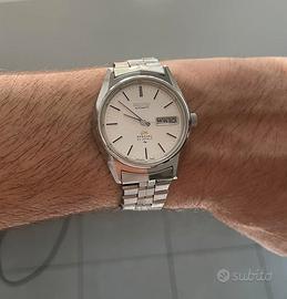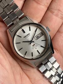 Seiko Lord Matic referenza LM Special 5216-7080 23J quadrante bianco automatico,orologio perfetto del 1974, Cassa Acciaio da 37 millimetri ad esclusione della corona di carica,Dial originale bianco,sfere in splendide condizioni,corona doppio scatto Ok per cambio data e giorno rapido, vetro in perfette condizioni , doppio calendario inglese e kanji, movimento a carica automatica a 23 rubini Calibro Seiko 5216A con fermo macchina e possibilità di carica manuale perfettamente funzionante e con buona tenuta del tempo e riserva di carica , raro bracciale originale, non possiedo scatola e garanzia ,orologio con i suoi normali segni di usura lievi del tempo, ripeto in perfette condizioni