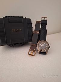 Cinturino "Tropic" con fibbia effetto bronzato ed altro cinturino in pelle con fibbia che richiama il colore della cassa dell'orologio.