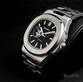 Ispirato al design del Patek Philippe Nautilus, questo Seiko mod reinterpreta l’iconico modello con quadrante nero e finestra open heart che mostra il bilanciere del movimento. Monta il movimento automatico Seiko NH38, combinando precisione e affidabilità. Unisce eleganza sofisticata e funzionalità moderna, risultando un compagno ideale senza compromessi.
