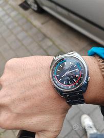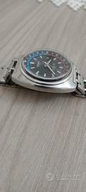Seiko Navigator Timer referenza 6117-6410, funzionalità GMT (fuso orario multiplo) caratteristico design "Pepsi" della ghiera interna, orologio perfetto del 1972. Utilizza il movimento automatico Seiko Calibro 6117B con 17 rubini (jewels) e funzione GMT. L'orologio dispone di una lancetta GMT che indica un secondo fuso orario sulla ghiera interna girevole bicolore (blu e rossa), comandata dalla corona. Il quadrante è nero e presenta la data a ore 3. La cassa è in acciaio inossidabile con un diametro di circa 41 mm,Water 70m Proof ,raro bracciale originale Non possiedo scatola e garanzia, orologio con i normali segni di usura lievi del tempo, ripeto in perfette condizioni come si vede in foto
