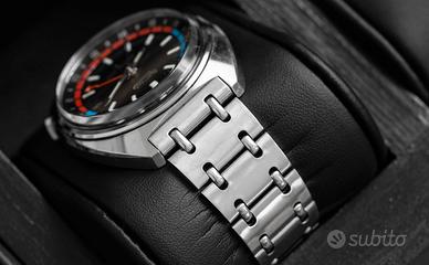 Seiko Navigator Timer referenza 6117-6410, funzionalità GMT (fuso orario multiplo) caratteristico design "Pepsi" della ghiera interna, orologio perfetto del 1972. Utilizza il movimento automatico Seiko Calibro 6117B con 17 rubini (jewels) e funzione GMT. L'orologio dispone di una lancetta GMT che indica un secondo fuso orario sulla ghiera interna girevole bicolore (blu e rossa), comandata dalla corona. Il quadrante è nero e presenta la data a ore 3. La cassa è in acciaio inossidabile con un diametro di circa 41 mm,Water 70m Proof ,raro bracciale originale Non possiedo scatola e garanzia, orologio con i normali segni di usura lievi del tempo, ripeto in perfette condizioni come si vede in foto