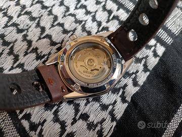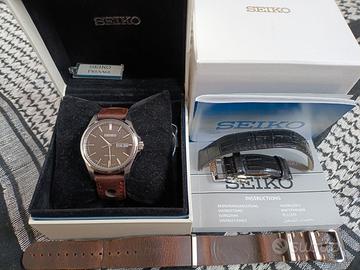 Vendo Seiko Presage SRP467J2 del 2015. Uniproprietario, usato mediamente un paio di volte al mese, mai urtato o caduto, in condizioni molto buone. Presenta solo lievissimi segni sulla lunetta davvero difficili da vedere. Il movimento non avrà bisogno di revisione per diversi anni. Come da foto, è completo di scatola e controscatola originali, documenti, cinturino Seiko originale mai usato, cinturino NATO in pelle, e cinturino racing in pelle con fibbia deployante. Pagamento in contanti, oppure tramite Paypal con spedizione al costo di 10€. Vendita con formula visto e piaciuto, non si accettano resi. No permute o scambi. PREZZO NON TRATTABILE. Dati tecnici: - Movimento Seiko 4R36, automatico, carica manuale, fermo macchina, riserva di carica 42 ore - Vetro zaffiro - Corona a pressione - Fondello a vista avvitato - Cassa acciaio 916L - Resistenza 100m - Diametro cassa 39mm - Spessore cassa 11mm - Distanza ansa - ansa 48mm - Larghezza anse 20mm