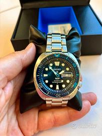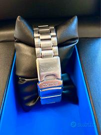 Orologio Seiko Prospex PADI "The great blue" Special Edition, referenza SRPK01K1. Ottime condizioni a parte le classiche righe da "appoggio" sulla chiusura del bracciale (vedere foto). Anno 3/2024, visibile su appuntamento. Orologio subacqueo professionale in edizione speciale "THE GREAT BLUE", dotato di calibro 4R36 con una riserva di carica di 41 ore. Cassa in acciaio con l'iconica forma “King Turtle” e bracciale in acciaio inossidabile con rivestimento antigraffio. Ghiera girevole unidirezionale in ceramica. Impermeabilità garantita fino a 200 metri. Diametro cassa 45 mm, vetro zaffiro. Il motivo del quadrante riflette la superficie dell'Oceano vista da sotto l'acqua, con la luce del sole che scende e la superficie dell'acqua in movimento. Caratteristiche tecniche Colore quadrante Blu Materiale Cassa Acciaio Diametro Cassa 45mm Spessore Cassa 13,22 mm Vetro Zaffiro Resistenza all'acqua 200 metri/ 20 BAR Movimento Automatico Specifica Movimento 4R36 Ansa 22mm