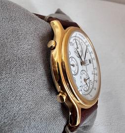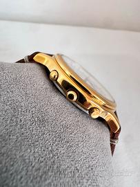 Modello e Dimensioni Si tratta di un Seiko Quartz Chronograph in stile vintage, molto apprezzato dai collezionisti per il suo movimento al quarzo di alta qualità. Modello Identificat • Calibro-Cassa: 7T32-6A50 • Nota: Puoi confermarlo guardando l'incisione sul fondello in acciaio inossidabile. "7T32" si riferisce al movimento (che include cronografo e sveglia) e "6A50" al design della cassa. • Serie: Seiko 7T32 Chronograph (comunemente degli anni '90). • Caratteristiche: Cassa dorata, quadrante bianco con numeri arabi, tre sotto-quadranti (minuti cronografici, secondi continui e quadrante della sveglia) e finestra della data a ore 3. Dimensioni Stimante Trattandosi di un modello classico della fine degli anni '80 / anni '90, le dimensioni sono più contenute rispetto agli orologi moderni: • Diametro della cassa: da 37 mm a 39 mm (esclusa la corona). • Spessore: 10 mm. • Larghezza anse (cinturino): 18 mm o 19 mm. • Distanza da ansa ad ansa (Lug-to-lug): da 43 mm a 45 mm.