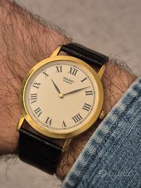 🎩 Seiko Ultra Slim "Roman Dial" – Eleganza Senza Tempo In vendita un raffinato Seiko Quartz (Ref. 5Y94-8000), un orologio che incarna lo stile "dress watch" classico. Grazie al suo profilo ultra-sottile e al quadrante bitonale, è l'accessorio perfetto per occasioni formali o per chi ama un'eleganza discreta e vintage. Specifiche Tecniche e Condizioni: * Movimento: Quarzo giapponese Seiko cal. 5Y94, sinonimo di precisione e affidabilità. Batteria appena sostituita, marcia perfettamente. * Quadrante: Color bianco panna con grandi numeri romani neri. Presenta una raffinata fascia argentata esterna con minuteria a contrasto che dona profondità e un tocco "Art Déco". * Lancette: Splendide lancette a foglia laccate nere, che garantiscono una leggibilità eccezionale su fondo chiaro. * Vetro: Vetro originale Seiko nuovo, appena installato, perfetto e privo di qualsiasi segno o graffio. * Cassa: Dorata in ottime condizioni generali, con una lucentezza che valorizza il design minimale. * Cinturino: Nuovo, in vera pelle nera con stampa coccodrillo, che completa il look classico dell'orologio. Dimensioni: * Diametro: 34 mm (esclusa corona) – ideale per un polso maschile elegante o come oversize femminile. * Lug-to-Lug: 39 mm * Spessore: Solo 6 mm (estremamente piatto, si dimentica di averlo al polso). Orologio pronto all'uso, revisionato esteticamente con vetro e batteria nuovi. Un classico Seiko intramontabile. #seiko #seikovintage #seikoquartz #dresswatch #vintagewatch #orologiovintage #seiko5y94 #ultraslim #classicedge #romandial #orologiodapolsio #japanmovement #crocoleather #elegantstyle #vintagestyle #seikocollector #watchesofinstagram #vinteditalia #vintedfrance