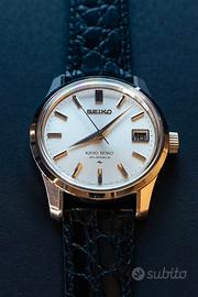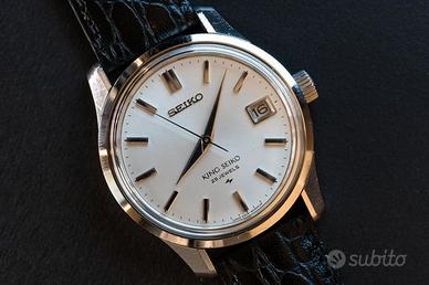 Seiko King Seiko referenza 4402-8000 quadrante argento automatico orologio perfetto del settembre 1967, Cassa in Acciaio inossidabile con anse spesse e spigoli vivi, tipica dello stile "Grammar of Design" di Seiko, da 36 millimetri ad esclusione della corona di carica, Dial originale argento , sfere in splendide condizioni , corona originale con logo ks Ok , vetro in perfette condizioni , movimento a carica automatica Hi Beat 36000 alternanze, Calibro Seiko 4402A con fermo macchina e possibilità di carica manuale perfettamente funzionante e scatto rapido data , e con buona tenuta del tempo e riserva di carica ,medaglione dorato con il logo sul fondello a vite, non possiedo scatola e card di garanzia , orologio con i suoi normali segni di usura lievi del tempo, ripeto perfetto