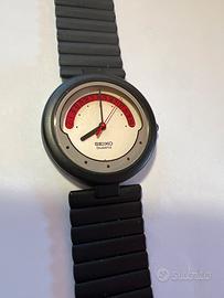 orologio Seiko Rivoli, un vero pezzo di design vintage risalente a cavallo tra gli anni '80 e '90. L'orologio è un fondo di magazzino (New Old Stock): non è mai stato usato, è privo di segni di usura, graffi o difetti estetici. Caratteristiche principali: Design Unico: Quadrante bianco minimalista con un particolare arco rosso superiore che funge da indicatore della data (datario a semicerchio). Stato di Conservazione: Nuovo, mai indossato. Vetro e cassa immacolati. Movimento: Quarzo giapponese Seiko di alta precisione (richiede batteria nuova per il funzionamento). Cinturino: Originale in gomma nera con l'iconica lavorazione a coste orizzontali, ancora flessibile e perfettamente conservato. Stile: Un pezzo da collezione per gli amanti del design postmoderno e degli orologi rari.